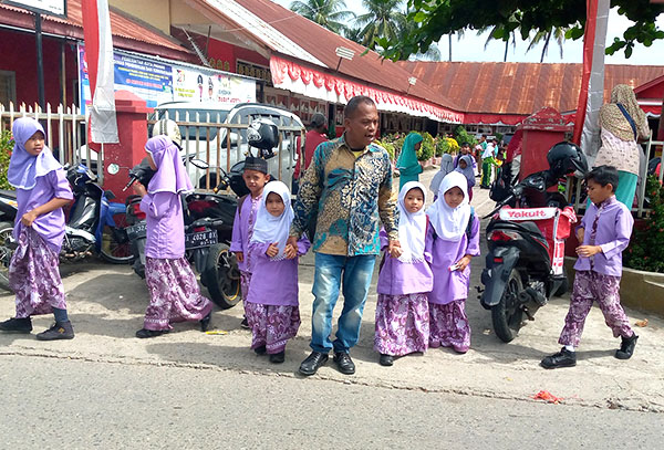 “Saya datang pagi sekali, lalu kontrol lingkungan, kemudian balik ke pintu gerbang untuk mengawasi anak-anak saat masuk sekolah. Saat pulang sekolah, saya akan tungga sampai semua murid sudah dijemput orangtua, baru saya pulang,” kata Zainal. (ped)