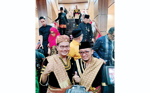 BAJU ADAT MINANG— Kepala Departemen Komunikasi & Hukum Perusahaan PT Semen Padang, Iskandar Z Lubis (kiri) foto bersama Wali Kota Padang Hendri Septa (kanan), saat menghadiri Paripurna Istimewa Hari Jadi Kota Padang ke-353 tahun, Minggu (7/8).