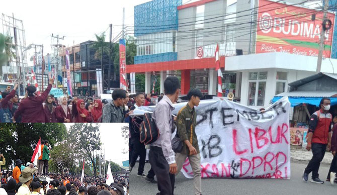 Mahasiswa berjalan menuju Gedung DPRD Sumbar. Dari corak almamater yang dikenakan, beberapa mahasiswa diketahui berasal dari UIN IB Padang, Unand, UNP, UBH, dan PNP. Banyaknya mahasiswa yang terus berdatangan, aparat keamanan pun melakukan penjagaan di seputaran Gedung DPRD Sumbar sejak pagi. Terlihat juga Polisi Anti Huru Hara dengan kendaraan Water Cannon bersiaga.