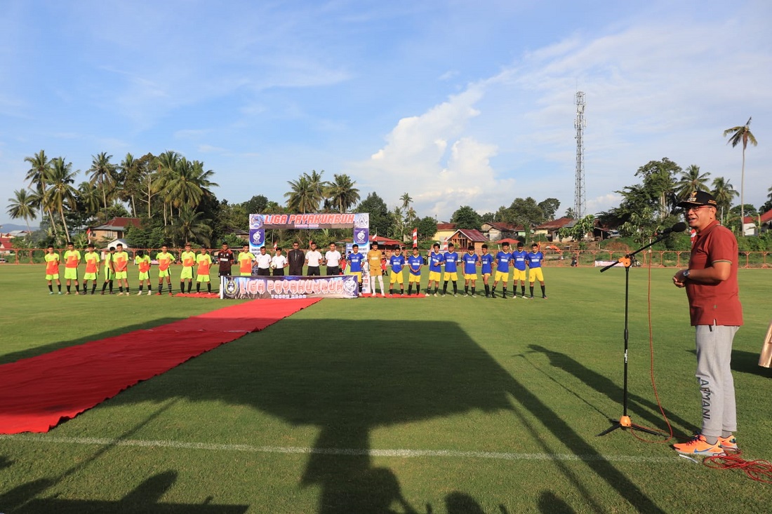 BATANGAGAM, METRO–Wali Kota Payakumbuh, H Riza Falepi menendang bola tanda dimulainya pertandingan sepak bola pembuka Liga Payakumbuh antara Porseba FC melawan Bintang Timur di lapangan sepak bola yang berada di Kawasan Batang Agam, Kelurahan Tanjuang Pauah, Sabtu (10/9) sore.
