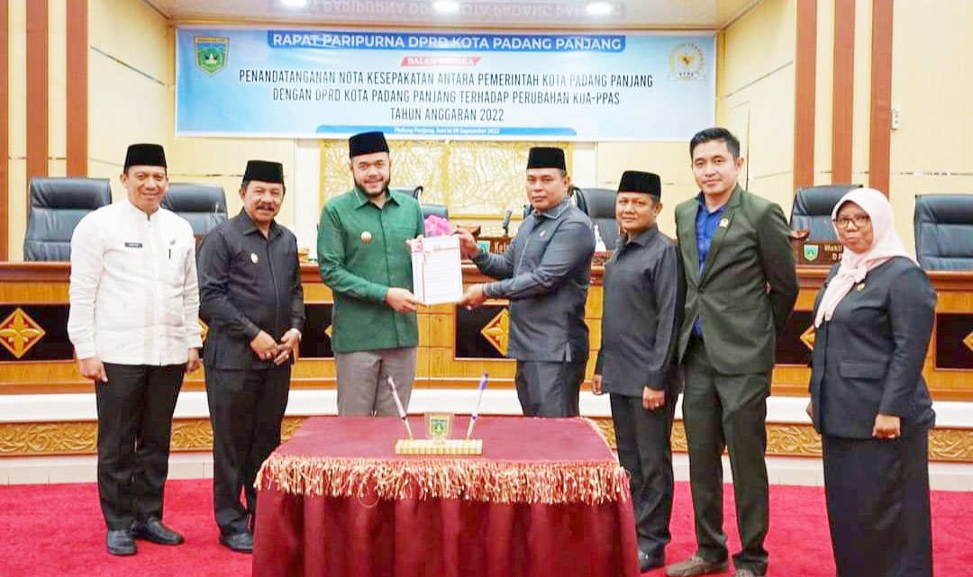 Nota kesepakatan antara Pemko dengan DPRD No. 900/297/BPKD-PP/IX/2022 – 176/004/DPRD-PP/IX/2022 tentang Perubahan Kebijakan Umum Anggaran Pendapatan dan Belanja Daerah TA 2022 serta Nota kesepakatan No. 900/298/BPKD-PP/IX/2022 – 176/005/DPRD-PP/IX/2022 tentang Perubahan PPAS TA 2022, ditandatangani Wali Kota, H Fadly Amran, BBA Datuak Paduko Malano bersama Wakil Wali Kota, Drs Asrul, Ketua DPRD, Mardiansyah, AMd, dan pimpinan DPRD lainnya dalam rapat paripurna, Jumat (9/9) di Ruang Sidang DPRD.