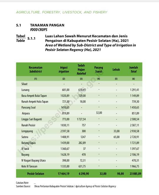 Data luas lahan sawah menurut kecamatan dan jenis pengairan di Kabupaten Pesisir Selatan ( Ha) 2021 area of wetland by sub – districk and type of irigation in Pesisir Selatan ( Ha) 2021.