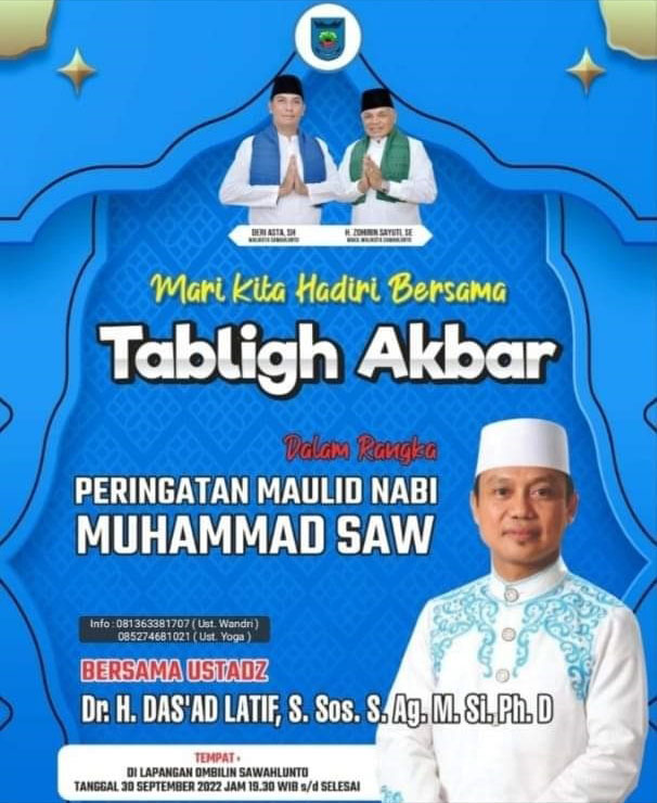Kepala Bagian Kesra Setdako Kota Sawahlunto Irwan menyebutkan bahwa kedatangan Ustadz Das’ad Latif untuk memeriahkan Peringatan Maulud Nabi Muhammad SAW 1444 Hijriah. “ Direncanakan di tanggal 30 September 2022 ini. Saat ini sedang dalam proses persiapan oleh Pemko Sawahlunto,” ujarnya.