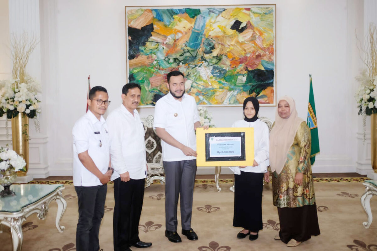 PADANG PANJANG, METRO–Wali Kota, H. Fadly Amran, BBA Datuak Paduko Malano memberikan Bantuan Beasiswa CSR Bank Nagari sebanyak Rp5 juta kepada Melliana Dwi Zahrani, Rabu (21/9). Bertempat di Rumah Dinas, Wako Fadly memberikan bantuan beasiswa kepada Zahra yang diterima di Universitas Al Azhar Indonesia (UAI). Hadir mendampingi Kepala Dinas Pendidikan dan Kebudayaan (Disdikbud), Drs. M. Ali Tabrani, M.Pd serta Camat Padang Panjang Barat, Fiori Agustian, SIP.