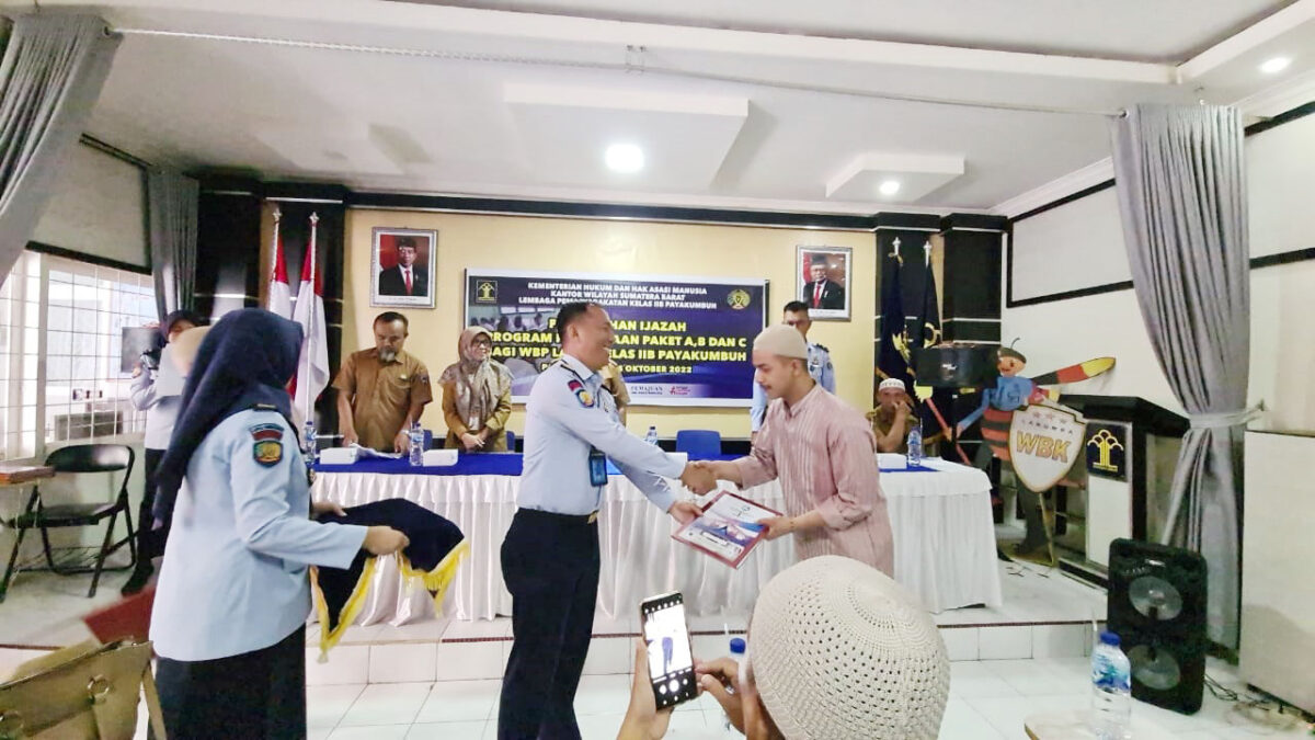 LIMAPULUH KOTA, METRO–Puluhan Warga Binaan Pemasyarakatan (WBP) di Lapas Payakumbuh menerima Ijazah Program Kesetaraan Paket A, B dan C yang diserahkan di Aula Lapas setempat pada Selasa (4/10). Selain dihadiri langsung Kepala Lapas Kelas II Payakumbuh, M, Kameily juga hadir Kepada Dinas Pendidikan Kota Payakumbuh, Dasril, Kabid PAUD serta Kepala SKB.