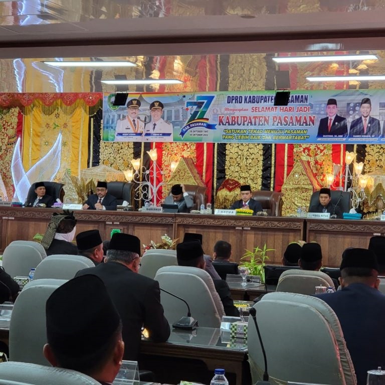 DPRD Kabupaten Pasaman menggelar Sidang Paripurna Istimewa Perayaan Hari Ulang Tahun (HUT) Kabupaten Pasaman ke-77 di ruang sidang paripurna DPRD, Sabtu (8/10). Sidang dipimpin Ketua DPRD Pasaman, Bustomi didampingi wakil Ketua Danny Ismaya, Bupati Pasaman H. Benny Utama, Wakil Bupati Pasaman Sabar AS dan dihadiri Anggota DPRD.