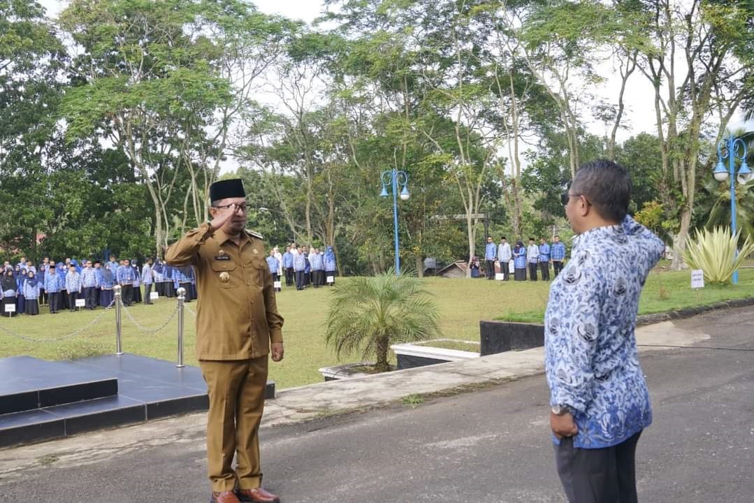 TANAHDATAR, METRO–Bupati Tanah Datar Eka Putra gelar apel gabungan Aparatur Sipil Negara (ASN) secara dadakan untuk mengecek kesiapan Aparatur Sipil Negara (ASN) dalam melayani masyarakat, di halaman Kantor Bupati di Pagaruyung, Senin (17/10). Dalam arahannya, Bupati Eka Putra apresiasi atas kinerja ASN disaat apel gabungan dadakan tersebut. “Sengaja saya lakukan apel pagi hari ini, tadi pagi pukul 6:14 WIB saya perintahkan langsung kepala BKPSDM untuk menggelar apel pagi ini. Alhamdulillah semua OPD hadir, itu menandakan kesiapan ASN dalam melayanani masyarakat. Saya apresiasi bapak ibu ASN di lingkungan kabupaten Tanah Datar yang telah bekerja dengan maksimal untuk mewujudkan visi dan misi daerah dan program unggulan, walau masih ada progul yang harus dicapai sebelum akhir tahun dan kami menyadari tanpa kerja keras, kerja cerdas dan kerja ikhlas tidak akan dapat mewujidkan progul tersebut,” ucap Bupati.