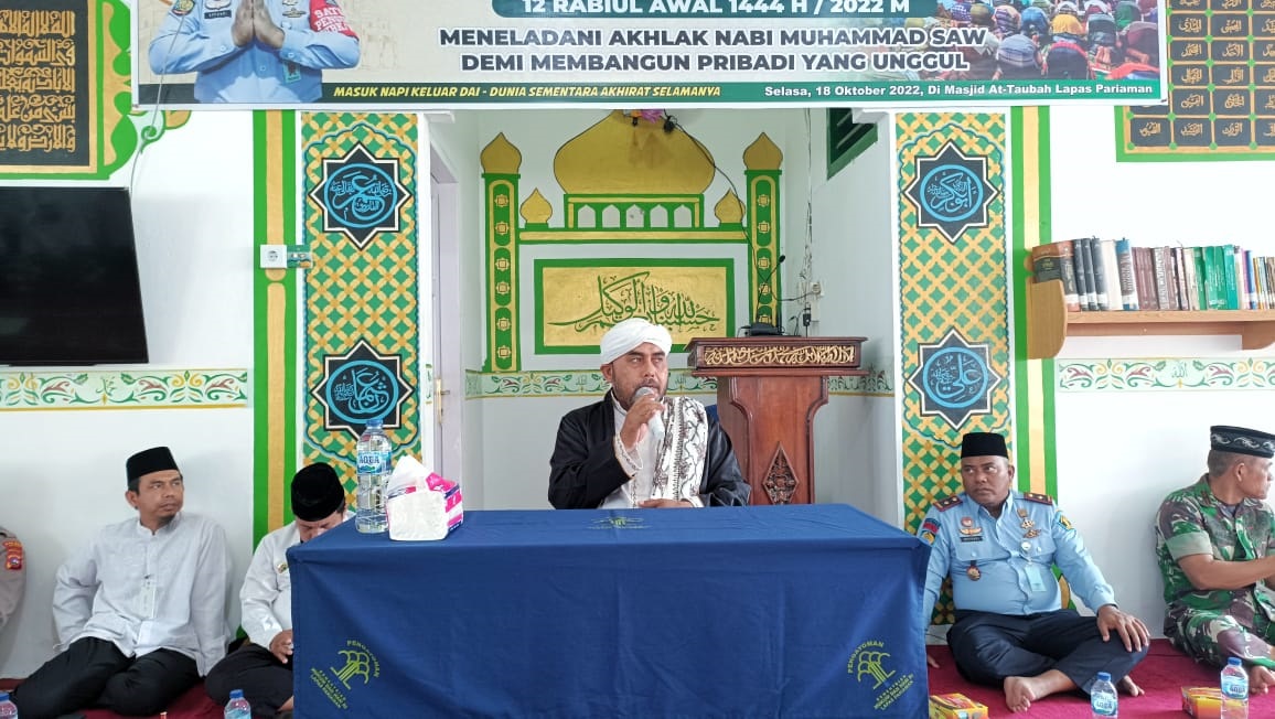 PARIAMAN, METRO–Dalam rangka peningkatan nilai-nilai Islam dan kualitas keimanan serta beribadah sesuai sunnah bagi warga binaan, Lembaga Pemasyarakatan (Lapas) klas II B Pariaman, kemarin, menggelar peringatan Maulid Nabi Muhammad SAW dengan thema meneladani akhlak Rasulullah SAW demi membangun pribadi yang unggul. Acara yang diawali pembacaan Kalam Illahi dan penampilan Nafiq Isbat oleh Warga Binaan Pemasyarakat itu, dilaksanakandi mesjid At Taubah Lapas Kelas II Pariaman di Kelurahan Karan Aur Kota Pariaman.