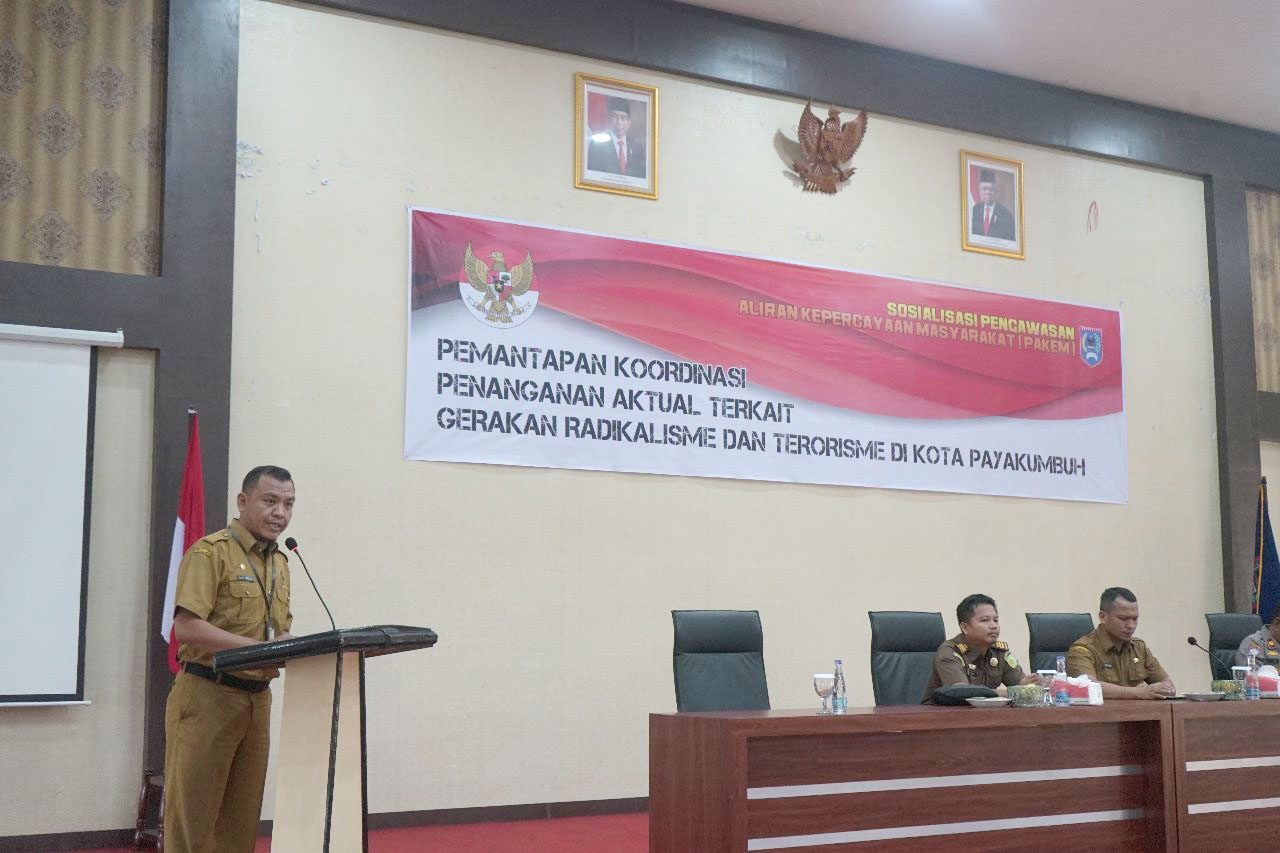 POLIKO, METRO–Pj Wali Kota Rida Ananda diwakili oleh assisten III Ifon Satria Chan membuka secara resmi sosialisasi pengawasan Aliran Kepercayaan Masyarakat (Pakem) dengan Tema Pemantapan Koordinasi Penanganan Aktual Terkait Gerakan Radikalisme dan Terorisme di Kota Payakumbuh yang di adakan Kesbangpol di Aula Ngalau Indah Lantai III Balai Kota Payakumbuh, Senin (24/10).