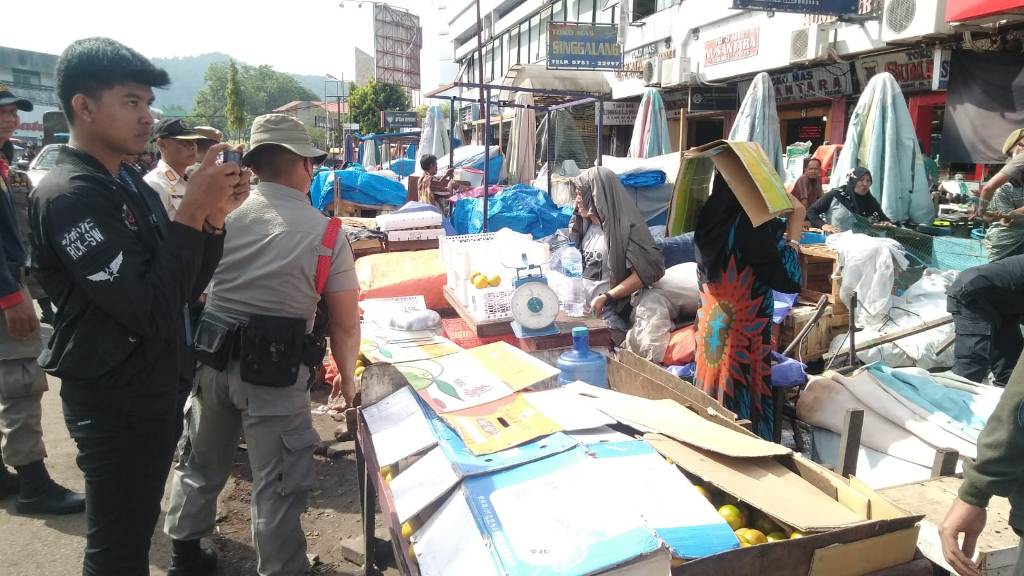 TAN MALAKA, METRO–Satu pleton anggota Satpol PP Kota Padang, diturunkan dalam melakukan penertiban terhadap Pedagang Kaki Lima (PKL) di kawasan Pasar Raya Barat, Kelurahan Kampung Jao, Kecamatan Padang Barat, Kamis (18/1). Penertiban dilakukan karena banyak pedagang yang membandel dan masih memakai badan jalan untuk berjualan, serta menimbulkan kemacetan di kawasan tersebut.