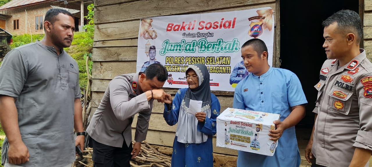 Pemberian Paket Sembako kepada Masyarakat yang kurang mampu dalam rangka Jumat berkah Polsek Linggo Sari Baganti Polres Pesisir Selatan yang bertempat di Kampung Koto Langang Nagari Rantau Simalenang, Kecamatan Linggo Sari Baganti, Kabupaten Pesisir Selatan.
