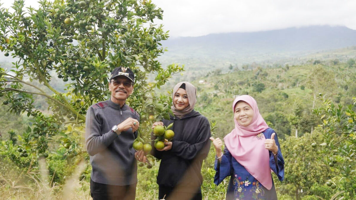 PETIK JERUK— Bupati dan Ketua PKK bersama Alya saat memetik jeruk di Gunuang Omeh.