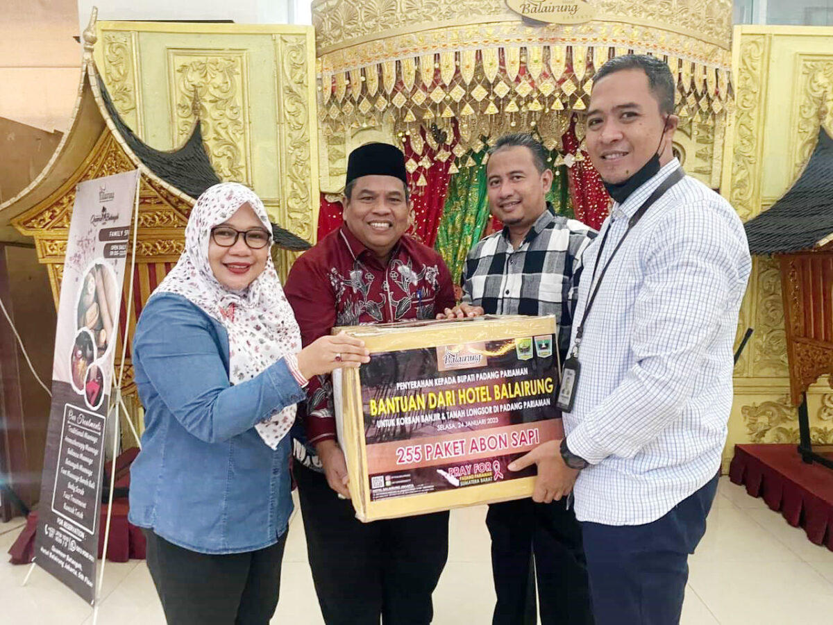 Katanya, bantuan yang diberikan oleh Hotel Balairung Jakarta ini untuk korban banjir dan tanah longsor di Padangpariaman sebanyak 255 paket abon sapi. Bantuan ini untuk meringankan masyarakat Padangpariaman yang terdampak musibah banjir. “Kita mengucapkan rasa terima kasihnya atas pemberian bantuan banjir dari hotel Balairung. Bantuan ini langsung kita serahkan untuk para korban musibah banjir. Namun bantuan bantuan lain akan terus berdatangkan untuk para korban musibah banjir ini,” ujarnya.