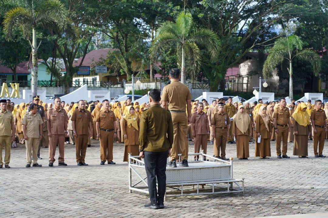 APEL GABUNGAN— Bupati Solok Selatan Khairunas memimpin apel gabungan ASN di halaman kantor Bupati Solok Selatan, Senin (6/2) pagi.