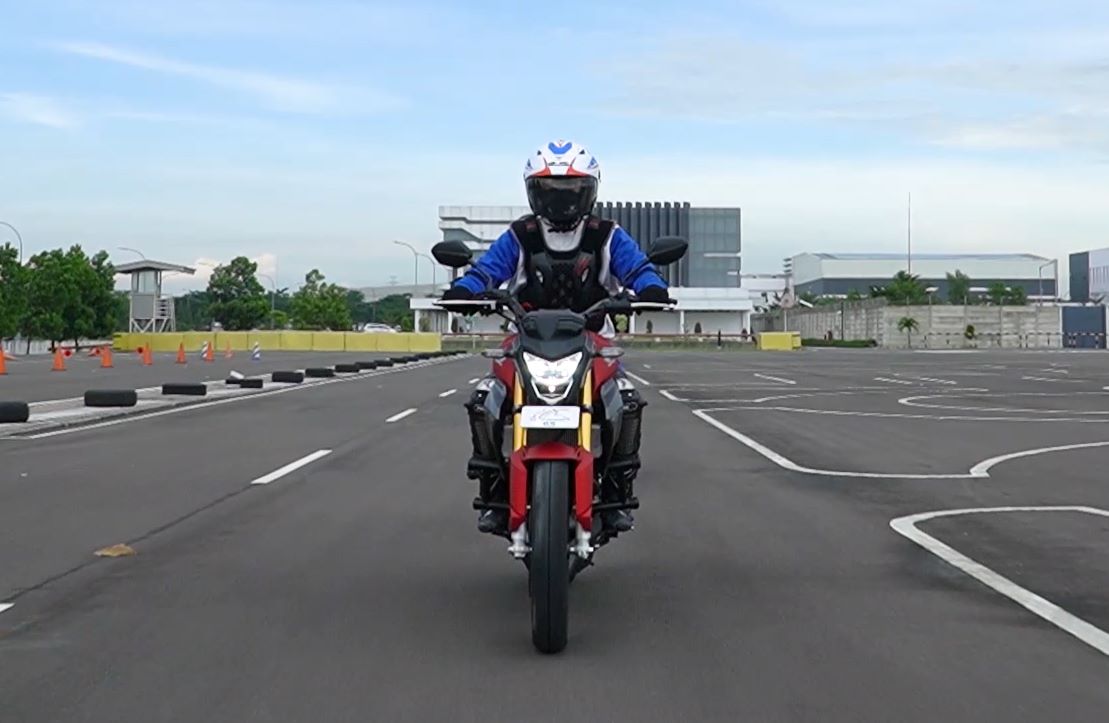 TEKNIK ENGINE BREAK— Instruktur Safety Riding Honda sedang memperagakan teknik engine break yang benar.