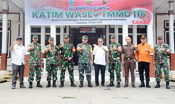 Kedatangan Tim Wasev TMMD ke-116 dan Dinas PMD Provinsi Sumbar disambut Komandan Satuan Tugas (Dansatgas) TMMD ke-116, Kodim 0319/Mentawai, Letkol Inf Suirwan, Pj Bupati Mentawai diwakili Asisten I Setdakab Kepulauan Mentawai, Nurdin, S.Sos.
