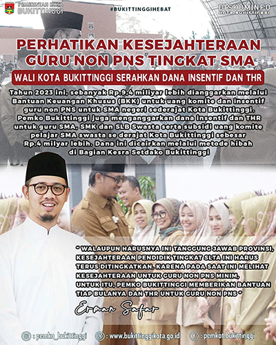 BUKITTINGGI, METRO–Pemerintahan Kota (Pemko) Bukittinggi terus konsisten dalam memperhatikan kesejahteraan guru non Pegawai Negeri Sipil (PNS). Tahun 2023 ini, tidak main-main sebanyak Rp9,4 miliyar lebih dianggarkan melalui Bantuan Keuangan Khusus (BKK) untuk uang komite dan insentif guru non PNS SMA negeri sederajat Kota Bukittinggi.