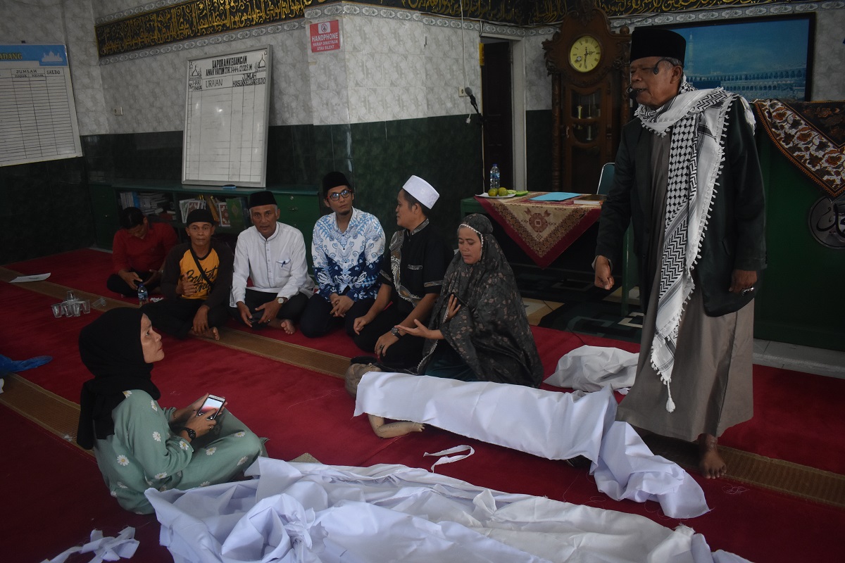 PENYELENGGARAAN JENAZAH— Pengurus Kongsi Tass sedang mempergakan cara tata penyelenggaraan jenazah disaksikan Ketua Kongsi Tass Ismetsyah dan Dean Asli Chaidir