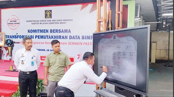 Kegiatan ini dilanjutkan dengan penandatanganan secara digital dan pembacaan komitmen bersama transformasi pemutakhiran data Simpeg yang dilakukan seluruh kepengawaian Hukum dan HAM Sumatera Barat. (rom)