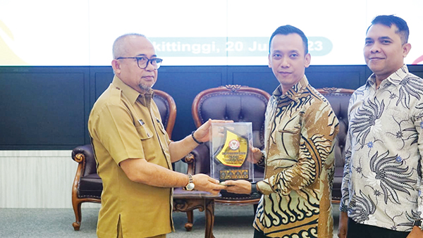 PENYERAHAN CENDERA MATA— Penyerahan cendera mata oleh Ketua KPID Sumbar kepada Kepala Dinas Komunikasi dan Informatika Kota Bukittinggi, Erwin Umar seusai Bimtek P3SPS, di Aula Balaikota Bukittinggi, Selasa (20/6).