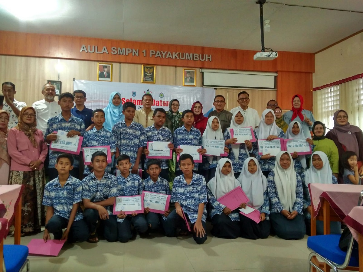 “Untuk tahap pertama ini kita berikan kepada 24 orang, sesuai target kita sampai 54 orang, dan bisa jadi bulan depan kita serehkan tahap berikutnya. Untuk orangtua asuhnya sendiri rata-rata alumni SMP Negeri 1, tetapi juga ada dari pemerhati se­perti Pj. Wali Kota Payakumbuh Rida Ananada, H Erwin Yunaz, dan Yernita, anggota DPRD Kota Payakumbuh. Jadi siapa saja boleh jadi orangtua asuh,” sebutnya.