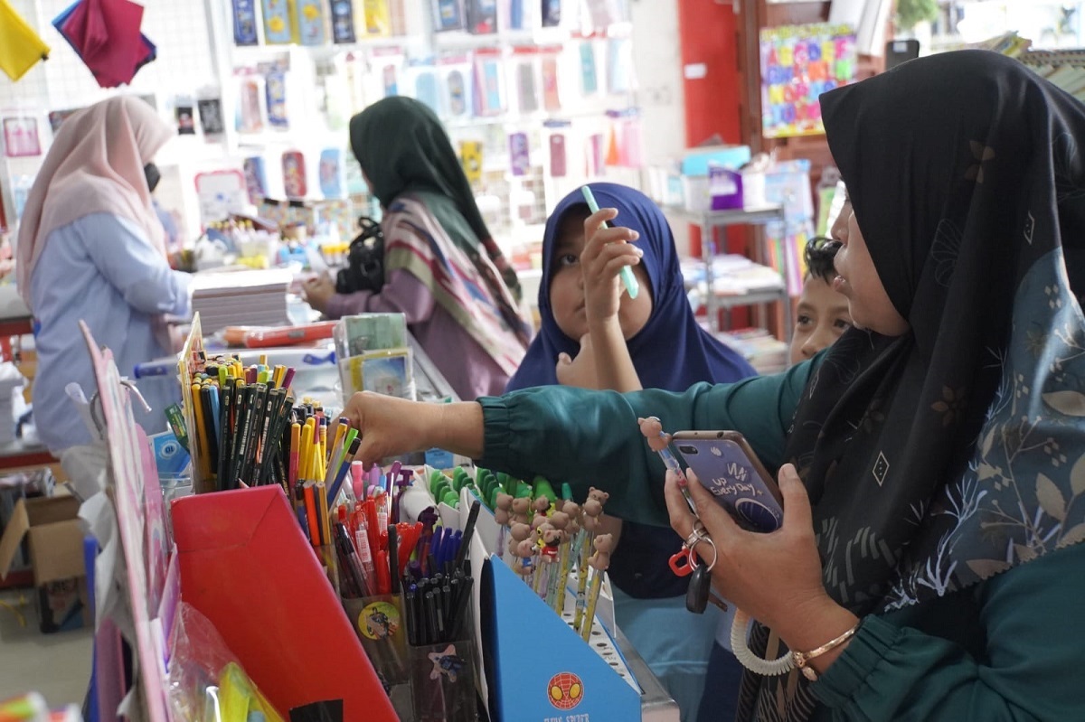 Salah satu toko buku dan alat tulis, Albana saat dikunjungi, Kamis (13/7), terlihat ramai pembeli. Pemilik Toko, Muhammad Hasbi kepada Kominfo menyampaikan, menjelang tahun ajaran baru omzet meningkat tiga hingga lima kali dari hari biasanya.