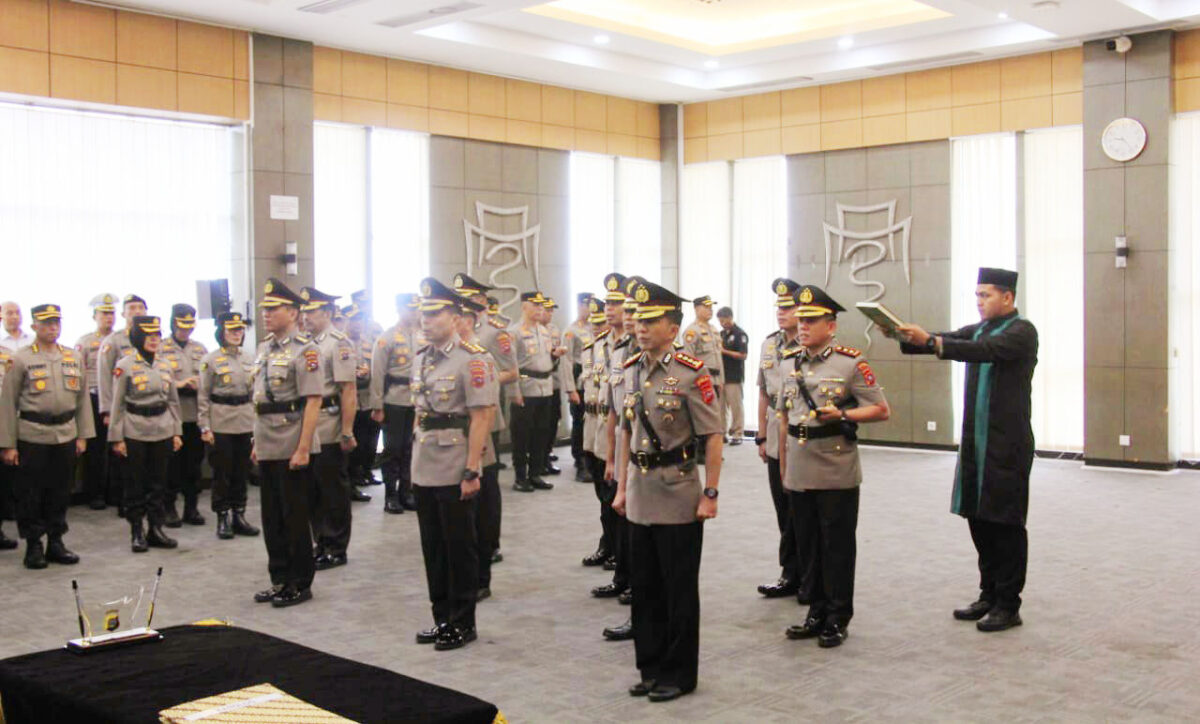 PENGAMBILAN SUMPAH— Prosesi pengambilan sumpah jabatan dalam serah terima jabatan tiga PJU dan tiga Kapolres di lingkungan Polda Sumbar.