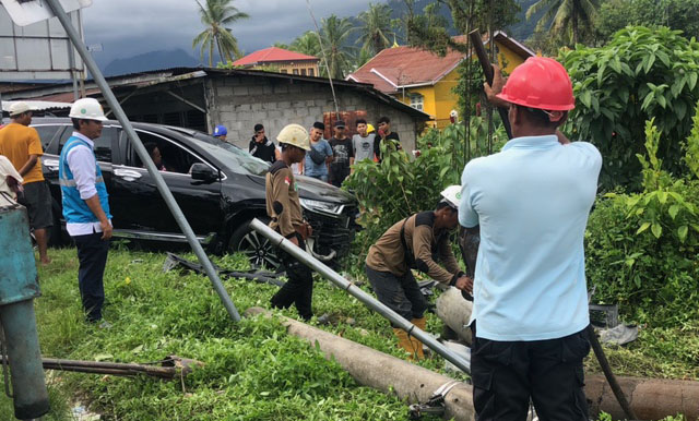 Saat ini kendaraan bermerk CRV warna hitam telah diangkut dengan mobil Toowing dan sedang dilakukan perbaikan listrik oleh pihak PLN akibat mobil yang menabrak tiang listrik yang menyebabkan putusnya aliran listrik tersebut. (cr1)