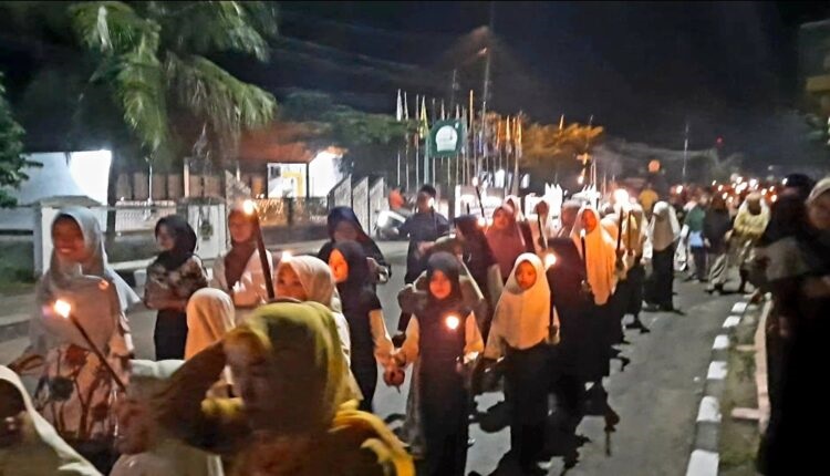 SIJUNJUNG, METRO–Ratusan warga Masjid Nurul Hidayah, Jorong Muaro Gambok, Nagari Muaro, Kecamatan Sijunjung, Kabupaten Sijunjung melakukan pawai obor dalam rangka peringatan malam tahun baru islam 1 Muharam 1445 H Tampak warga bersemangat memeriahkan peringatan tahun baru Islam dengan melakukan arak-arakan sambil membawa obor yang dipandu oleh Patwal Polres Sijunjung dan mobil Dinas Kominfo Sijunjung