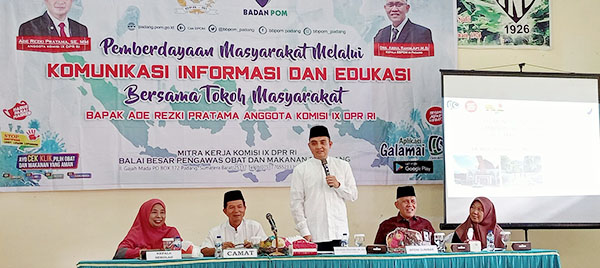 PDG. PARIAMAN, METRO–Legislator RI asal Su­matera Barat Ade Rezki Pratama dan Balai Besar Badan Pengawas Obat dan Makanan (BPOM) melakukan kegiatan pemberda­yaan masyarakat melalui komunikasi informasi dan edukasi tentang makanan dan obat-obatan bersama tokoh masyarakat di INS Kayutanam, Jumat (21/7).