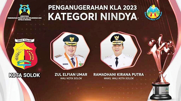 PENGAKUAN Kota La­yak Anak (KLA) kembali diraih Kota Solok. Peng­hargaan Kota Layak Anak Peringkat Nindya ini me­rupakan yang kedua ka­linya diraih Kota Solok.
