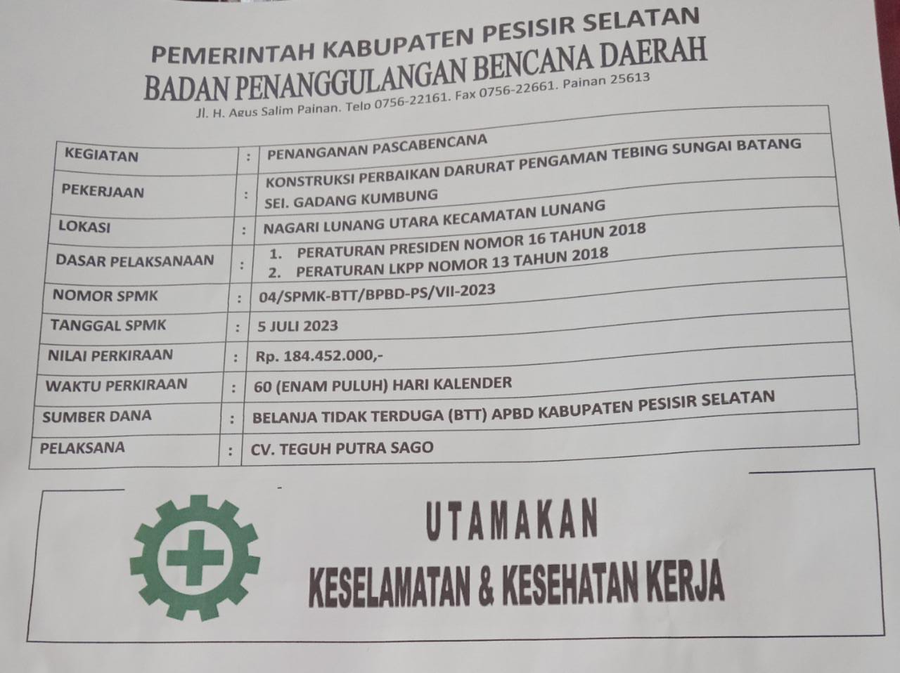 Ditemui Posmetro, Senin (31/7/2023) Kepala Badan Penangulangan Bencana Daerah ( BPBD) Pesisir Selatan Doni Gusrizal angkat bicara terkait plank papan proyek tersebut.