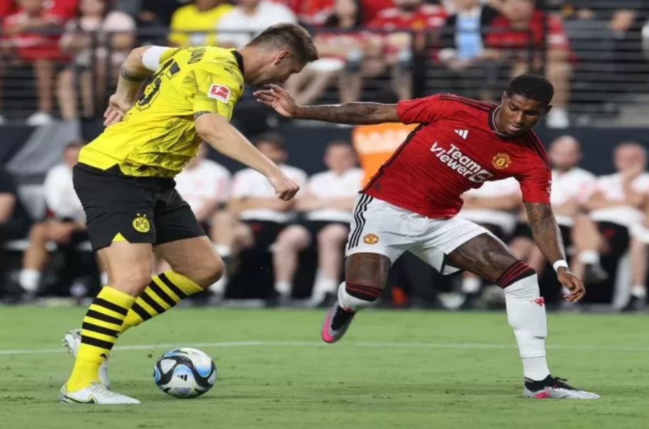 UJICOBA PRAMUSIM— Striker Manchester United, Marcus Rashford (kanan), berupaya melewati hadangan pemain Dortmund dalam ujicoba pra-musim.