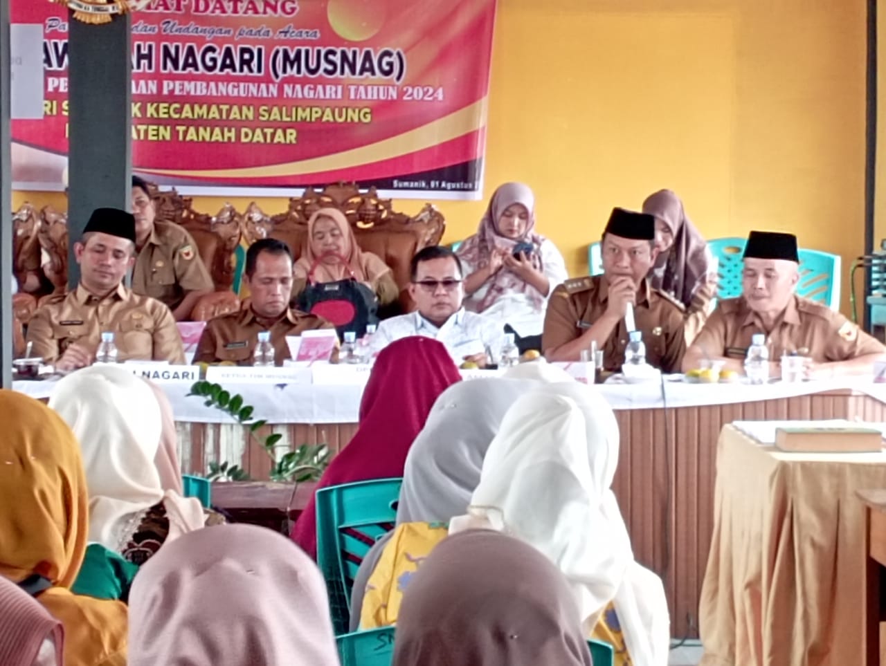 Musyawarah Nagari di buka oleh Ketua BPRN Ismet, SE dihadiri ketua Tim Fasilitasi Kabupaten Erizanur, OPD terkait, Wakil Ketua DPRD Tanah Datar Anton Yondra, SE., MM, Camat Salimpaung Khairunas, S.S.TP Kapolsek Salimpaung AKP M. R. ZEN, PLH Danramil 09 Serma Sawaludin dan Babinsa Serda Afdhil Tsani, Kepala Jorong se-Nagari Sumanik, KAN.(*)