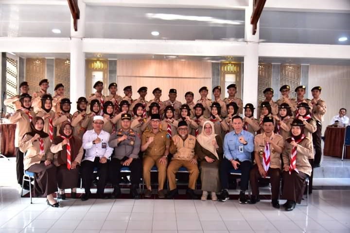 RAIMUNA NASIONAL— Wako Deri Asta berfoto bersama dengan peserta yang akan berangkat mengikuti Raimuna Nasional ke-XII di Bumi Perkemahan Cibubur, di Balairung Rumah Dinas Wali Kota, Senin (7/8).