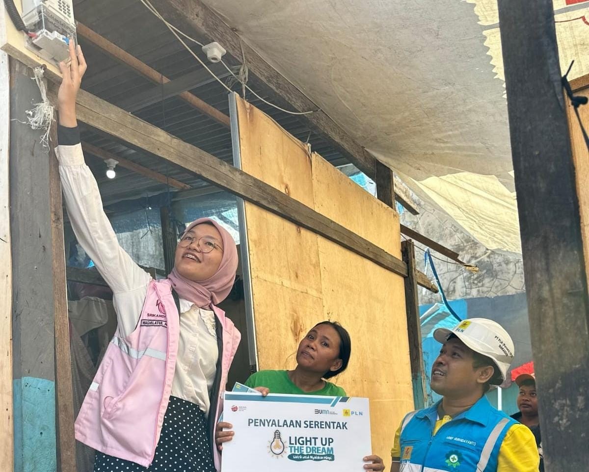 menyalakan --Shila tengah menyalakan secara simbolis dan mewujudkan mimpi Muliati (41) warga Kelurahan Rappojawa Kota Makassar untuk mendapatkan akses listrik gratis dalam program "Light Up The Dream".