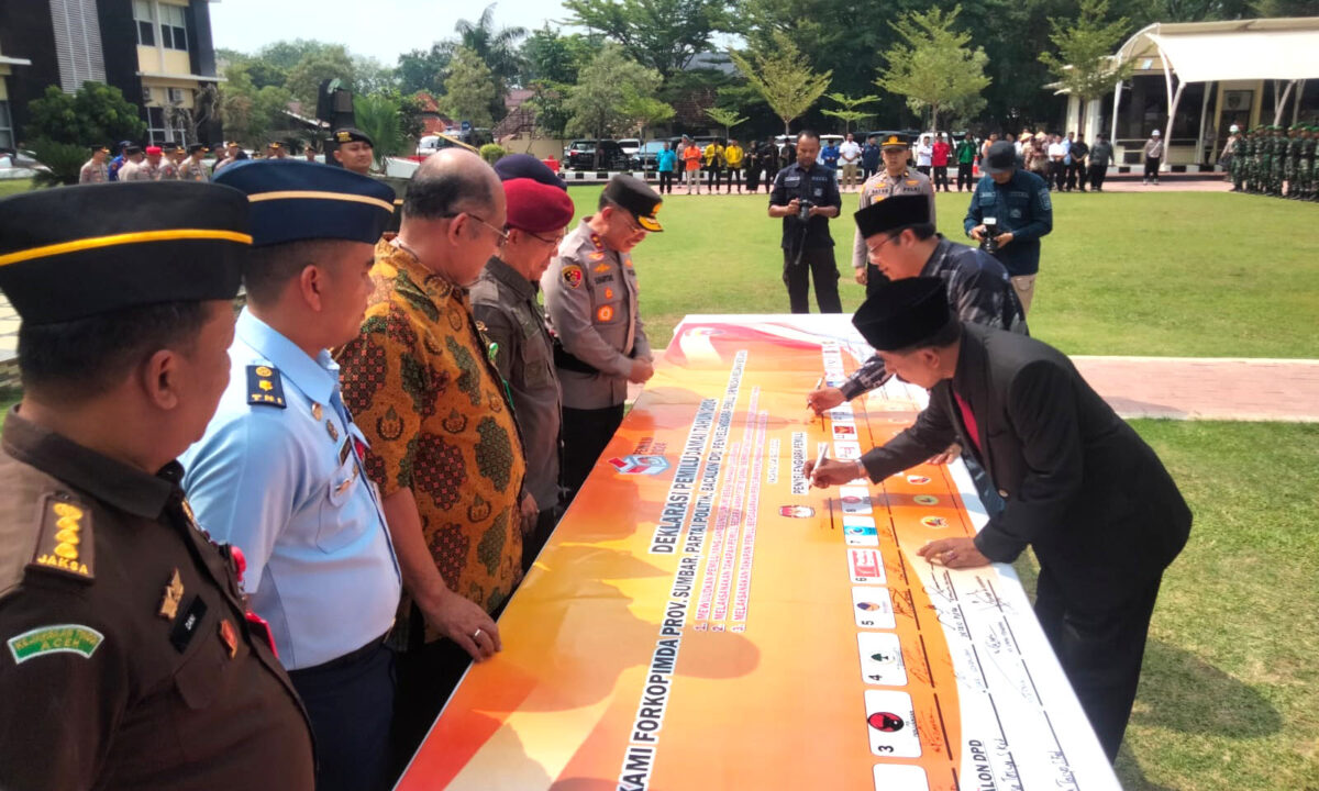 PADANG, METRO —Polda Sumatra Barat (Sumbar) menggelar Deklarasi Pemilu Damai 2024 dalam rangka mewujudkan situasi Kamtibmas yang aman dan kondusif, Kamis (24/8). Deklarasi itu dilakukan oleh Forkopimda, penyelanggara pemilu, pimpinan partai politik, ormas, relawan pendukung bacapres hingga para bakal calon legislatif.