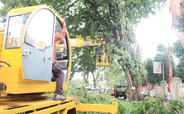 Pantauan POSMETRO, beberapa operator dari Tim Penebang I DLH, memangkas ranting serta dahan pohon tersebut dengan gergaji mesin. Untuk mencapai dahan yang tinggi, petugas menggunakan mobil tangga atau crane mobile milik Dinas Lingkungan Hidup, sehingga dapat menjangkau setiap sudut dari pohon tersebut.