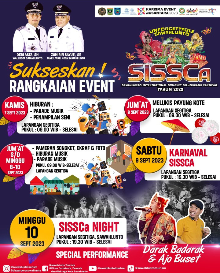 “Acara SISSCA diadakan sengaja malam hari dengan full lighting yang menarik, juga agar para peserta dan penonton tidak kepanasan dan menikmati SISSCA Sawahlunto dengan nyaman. Sehingga para penonton dan wisatawan yang datang betah untuk lebih mengenal suasana kota tua Heritage Unesco Sawahlunto di malam hari. Diharapkan kedepannya akan sering mengunjungi kota Sawahlunto dengan membawa kerabatnya,” ujar Adriyusman.