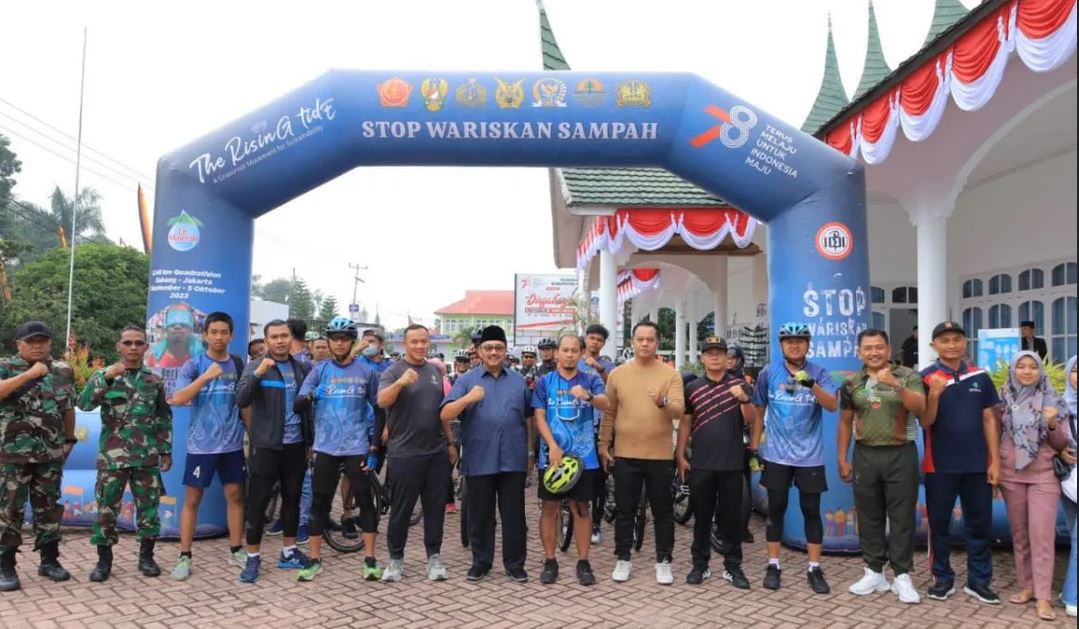 FOTO BERSAMA—Bupati Pasaman Benny Utama foto bersama dengan pesepeda, pembawa pesan lingkungan team l Kick off the Rissing Tide- A Tesonance 2023.