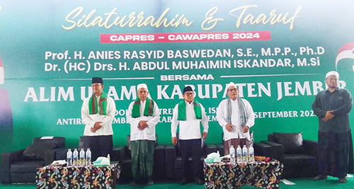 Kemudian, di lapis terakhir, keduanya disambut oleh para kyai dan pengurus Pondok Pesantren Nurul Islam semabri menuju panggung untuk menyapa dan memberikan sambutan dalam agenda bertajuk “Silaturahmi dan Ta’aruf Capres-cawapres 2024 Anies Baswedan dan Muhaimin Iskandar bersama Alim Ulama Kabupaten Jember”.