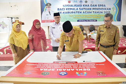 Selain membuka sosialisasi, Sekda Agam menandatangani deklarasi Satuan Pendidikan Ramah Anak (SPRA) bersama OPD yang turut menghadiri kegiatan tersebut. (pry)