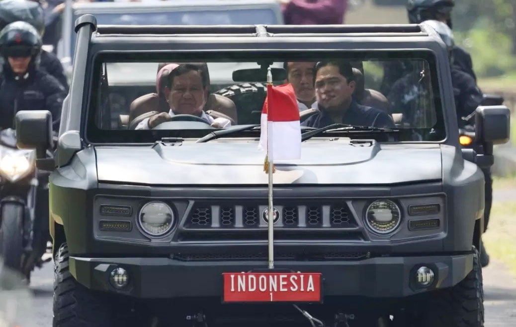 SOPIRI— Menhan Prabowo Subianto menyopiri Presiden Joko Widodo (Jokowi), Ibu Negara Iriana Jokowi dan Menteri BUMN Erick Thohir menggunakan Maung Pindad dalam kunjungan kerja ke Pabrik PT Pindad.