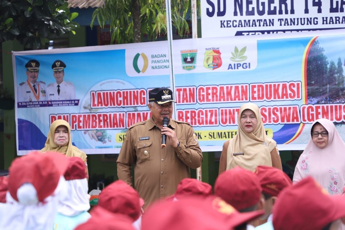 SOLOK, METRO–Wali Kota Solok, Zul Elfian Umar secara resmi melaunching Kegiatan Gerakan Edukasi dan Pemberian Makanan Bergizi Untuk Siswa (Genius), di SD Negeri 14 Laing, Senin (16/10). Turut hadir, Kepala Dinas Pendidikan Kota Solok, Irsyad, Kepala Dinas Pangan Kota Solok, Ade Kurniati, Kepala Dinas Pertanian Kota Solok, Zulkifli, Camat Tanjung Harapan, Hendrik, Lurah Laing, Kepala Sekolah, Majelis Guru serta para murid SDN 14 Laing.