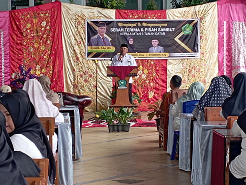 TANAHDATAR, METRO–Kepala Kantor Kemenag Kabupaten (Kemenag) Tanahdatar H. Amril menghadiri acara Serah Terima dan Pisah Sambut Kepala MTsN 6 Tanahdatar dari Plt. Syambasri, S.Ag pada MTSN 6 Tanahdatar Hj. Yulismar yang sebelumnya menjabat kepala MTsN 1 Tanahdatar, di aula terbuka MTsN Tanahdatar Selasa (24/10).