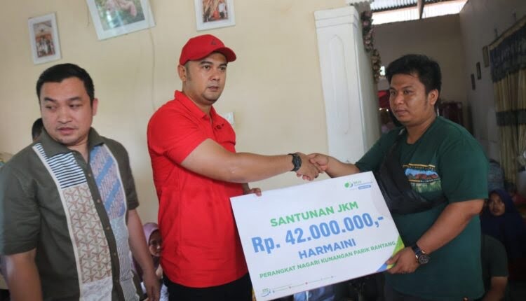 SIJUNJUNG, METRO–Bupati Kabupaten Sijunjung Benny Dwifa Yuswir, menyerahkan santunan Jaminan Kematian (JKM) sebesar Rp42 juta kepada ahli waris Harmaini yang didaftarkan jaminan sosial oleh Pemkab setempat.