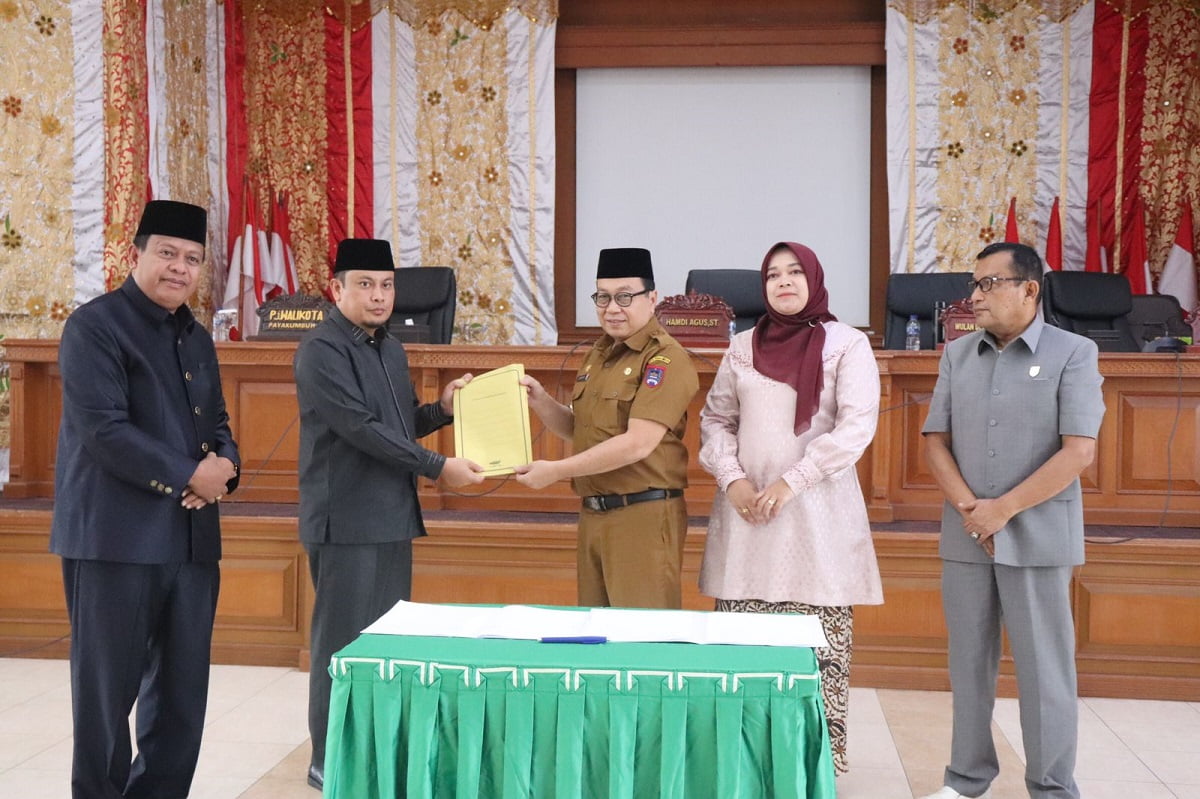 HASIL KAJIAN PANSUS— Ketua DPRD Hamdi Agus, menyerahkan hasil kajian Pansus DPRD terkait Dinas Pendidikan Kota Payakumbuh kepada Pj Wali Kota Payakumbuh, Jasman, Senin (6/11).
