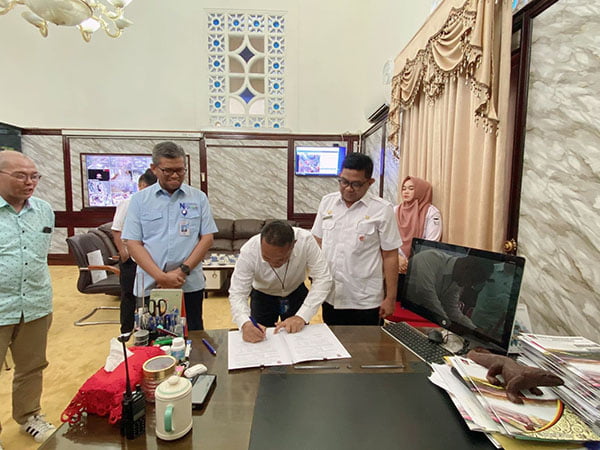 Simbolis penyerahan 4 unit kendaraan operasional dilakukan di Balai Kota Padang. Manager PLN UP3 Padang Yusuf Hadiyanto tandatangani peminjaman periode Oktober hingga Desember 2023 untuk 4 unit kendaraan ini, disaksikan oleh Pemimpin Bank Nagari Cabang Pasar Raya Hendri Masri dan Kepala Bappeda Kota Padang Yosefriawan.