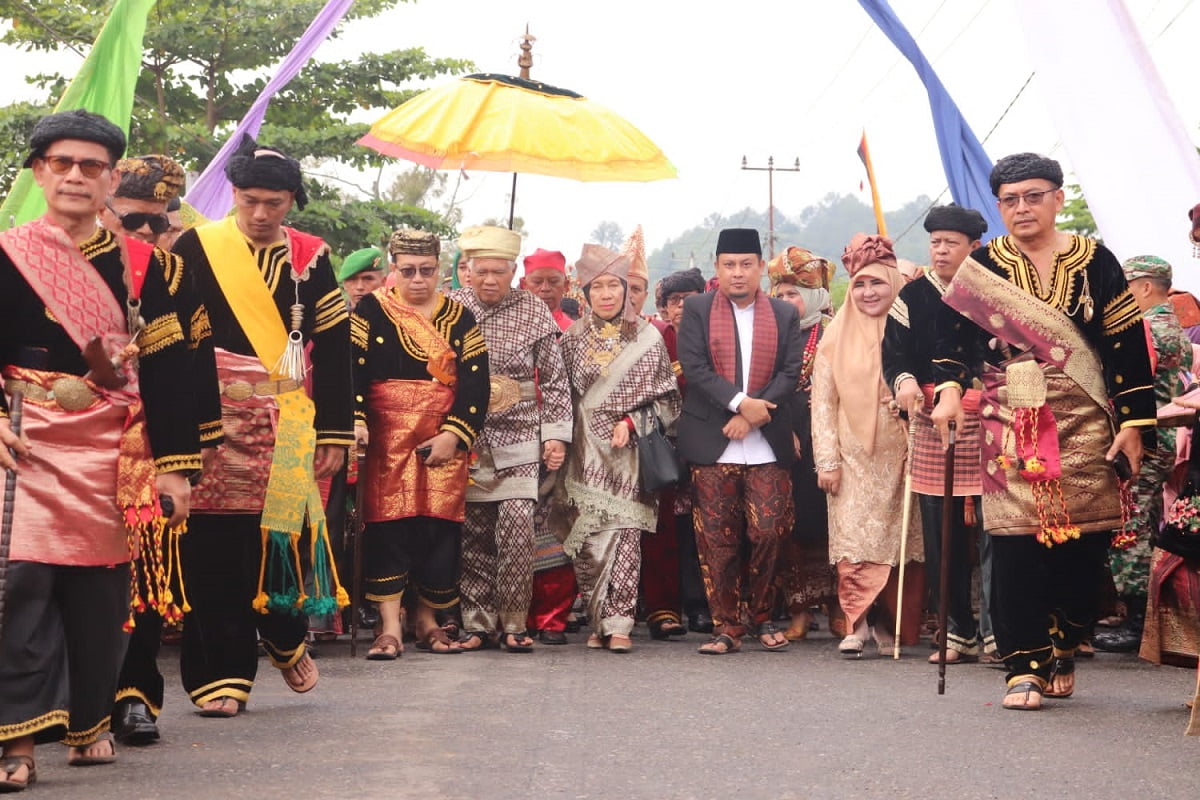 BATAGAK PANGHULU— Pj Wali Kota Jasman bersama Ketua DPRD Kota Payakumbuh Hamdi Agus, menghadiri acara Alek Silambang Urek Batogak Penghulu, di Medan Nan Bapaneh Balai Adat Nagori Aie Tabik.