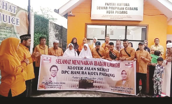 PADANG, METRO–Ketua DPC Partai Hanura Kota Padang, Dr Dian Anggraini Oktavia, S.Sos, MSi melepas 10 jamaah umroh yang mendapat hadiah jalan sehat Partai HaÂnura, Selasa (14/11).